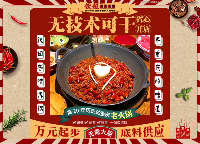 钦姐重庆火锅一直以继承川渝火锅文化为己任,一直深耕火锅行业,产品多样,不仅有毛肚火锅、菌汤火锅、还有
